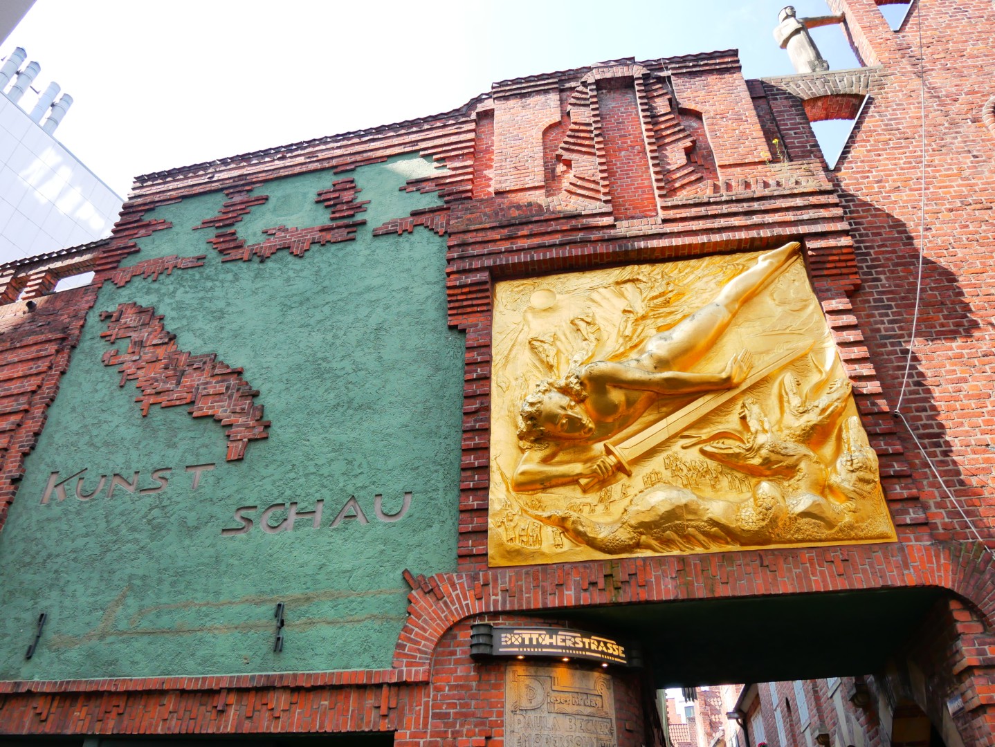 “Böttcherstrasse is a street in the historic centre of Bremen, Germany. Only about 100 m (330 ft) long, it is famous for its unusual architecture and ranks among the city’s main cultural landmarks and visitor attractions. Most of its buildings were erected between 1922 and 1931, primarily as a result of the initiative of Ludwig Roselius, a Bremen-based coffee-trader, who charged Bernhard Hoetger with the artistic supervision over the project. The street and its buildings are a rare example of an architectural ensemble belonging to a variant of the expressionist style. Several of the houses can be classed as Brick Expressionism.”