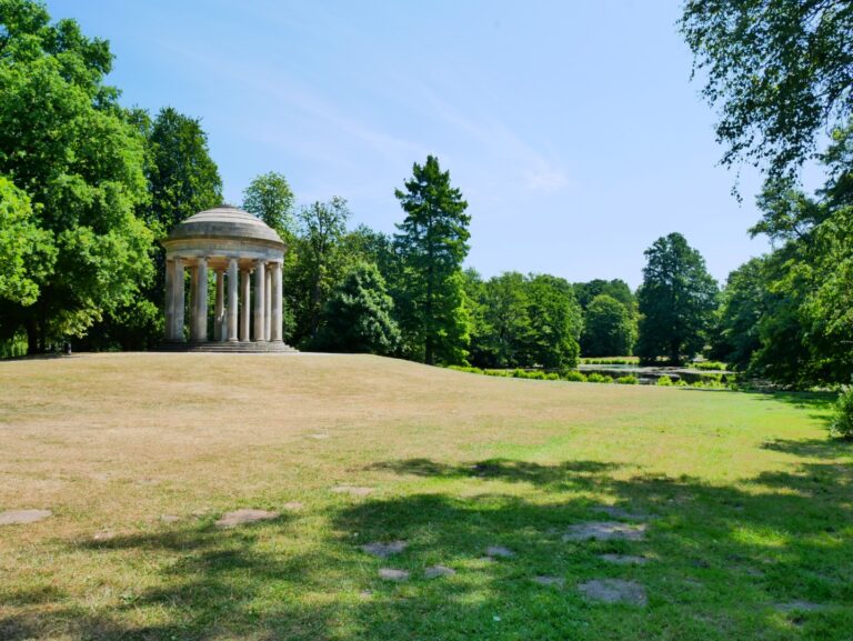 “The Leibniz Temple in Georgengarten was created as a pavilion with 12 ionic columns between 1787 and 1790 in honour of the Hannoverian universal scholar Gottfried Wilhelm Leibniz. It was the first monument ever to honour a person of non-noble descent in Germany. Originally the round temple building, created by royal court master builder Johann Daniel Ramberg, stood on Waterlooplatz. In 1935, it was moved to Georgengarten.”